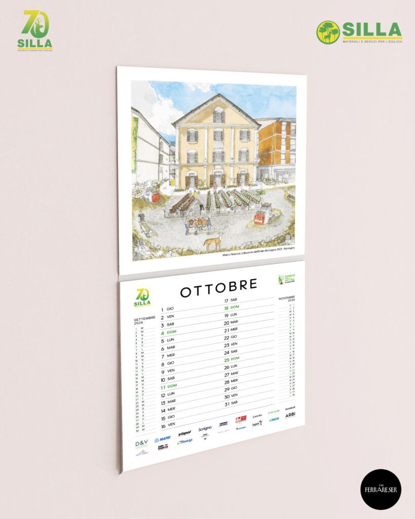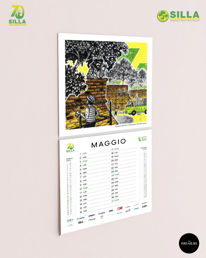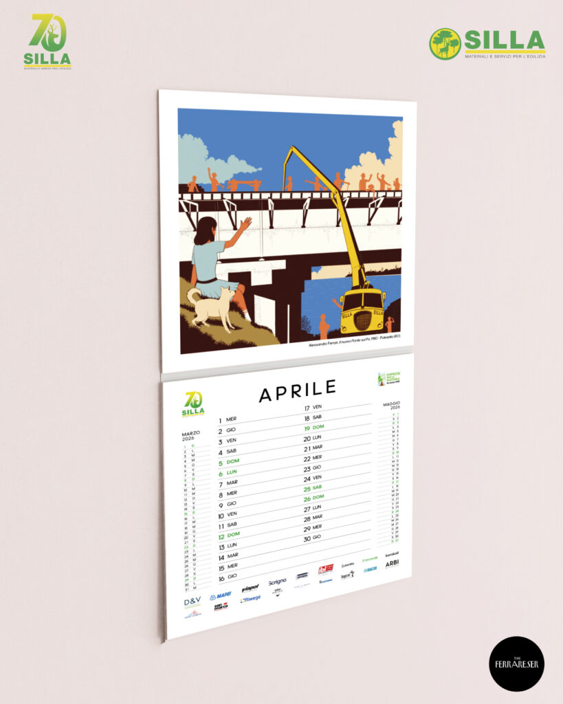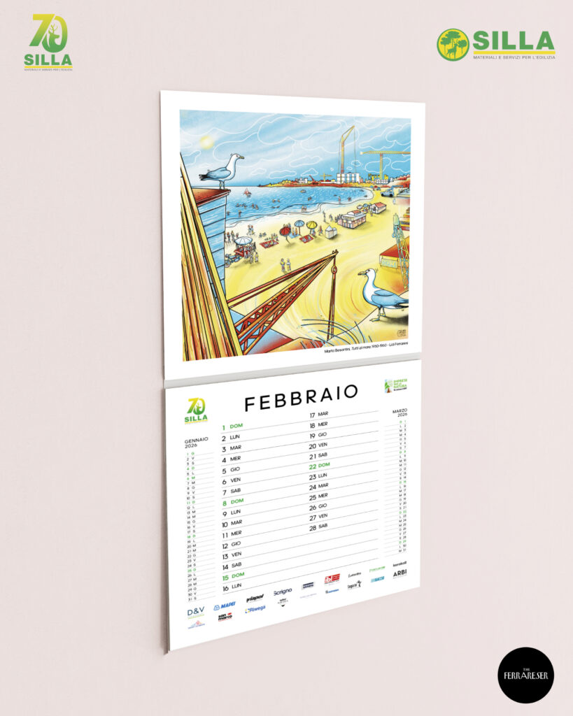 La copertina del calendario 20261. Le fondamenta, 1956 Copparo – La nascita dell’azienda S.I.L.L.A. a Copparo (Autore – Aggeo Caccia)2. Tutti al mare, 1950-1960 Lidi Ferraresi – Gli italiani scoprono il piacere delle vacanze, la nascita dei Lidi Ferraresi, accompagnata dallo sviluppo del territorio e di S.I.L.L.A. (Autore – Marta Besantini)3. Il miracolo economico, Anni ’60 Ferrara – Il calcestruzzo diventa il simbolo del progresso, Ferrara cambia volto, una città in crescita (Autore – Claudio Gualandi)4. Il nuovo Ponte sul Po, 1980 Polesella (RO) – Il vecchio ponte di chiatte viene sostituito dal nuovo ponte in cemento armato (Autore – Alessandro Ferrari)5. Le Mura Estensi, 1985 – 1988 Ferrara – Migliaia di mattoni per il recupero di uno dei simboli della città di Ferrara, che sono valsi il riconoscimento come Patrimonio dell’Umanità da parte dell’UNESCO (Autore – Francesco Marchetti)6. L’Espansione, 1980-2000 Emilia Romagna – Il periodo della crescita dell’azienda S.I.L.L.A. con l’apertura di nuove filiali in Emilia-Romagna e Veneto (Autore – Simone Campana)7. Digitization, 1990 Il Mondo – Il passaggio dall’analogico al digitale, una continua ed inarrestabile evoluzione. Proprio in questi anni il disegno tecnico a mano viene sostituito dal software AUTOCAD (Autore – Filippo Perelli)8. Il terremoto dell’Emilia, 2012 Modena, Ferrara, Bologna – La terra del Modenese e dell’alto ferrarese trema. È tempo di consolidare e ricostruire per rinascere (Autore – Gilda Cesari)9. Superbonus 110%, 2022-2023 Italia – Edifici “impacchettati”, cappotti termici, risparmio energetico, hanno caratterizzato le ristrutturazioni del Superbonus e dei fondi PNRR (Autore -Matteo Venturini)10. L’alluvione dell’Emilia-Romagna, 2023 Romagna – “Tien bota!” è quello che ha fatto questo territorio. Il drammatico evento è rappresentato dal Teatro Rossini di Lugo, dove S.I.L.L.A. è presente; anche le filiali di Ravenna e Lugo hanno subito ingenti danni (Autore -Marco Nascosi)1. Nuova apertura nel Veneto, 2023 Chioggia – Con la nuova filiale di Chioggia, S.I.L.L.A. è presente lungo tutto il tratto della Romea, da Ravenna passando per San Giuseppe di Comacchio e Mesola (Autore – Paolo Bevilacqua)12. L’AI nel settore edile, 2025 Il Mondo – Futuro e innovazione per una casa efficiente, sicura e sostenibile (Autore – Margherita Petrucci)