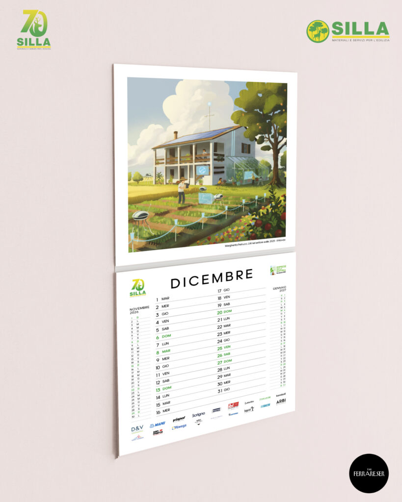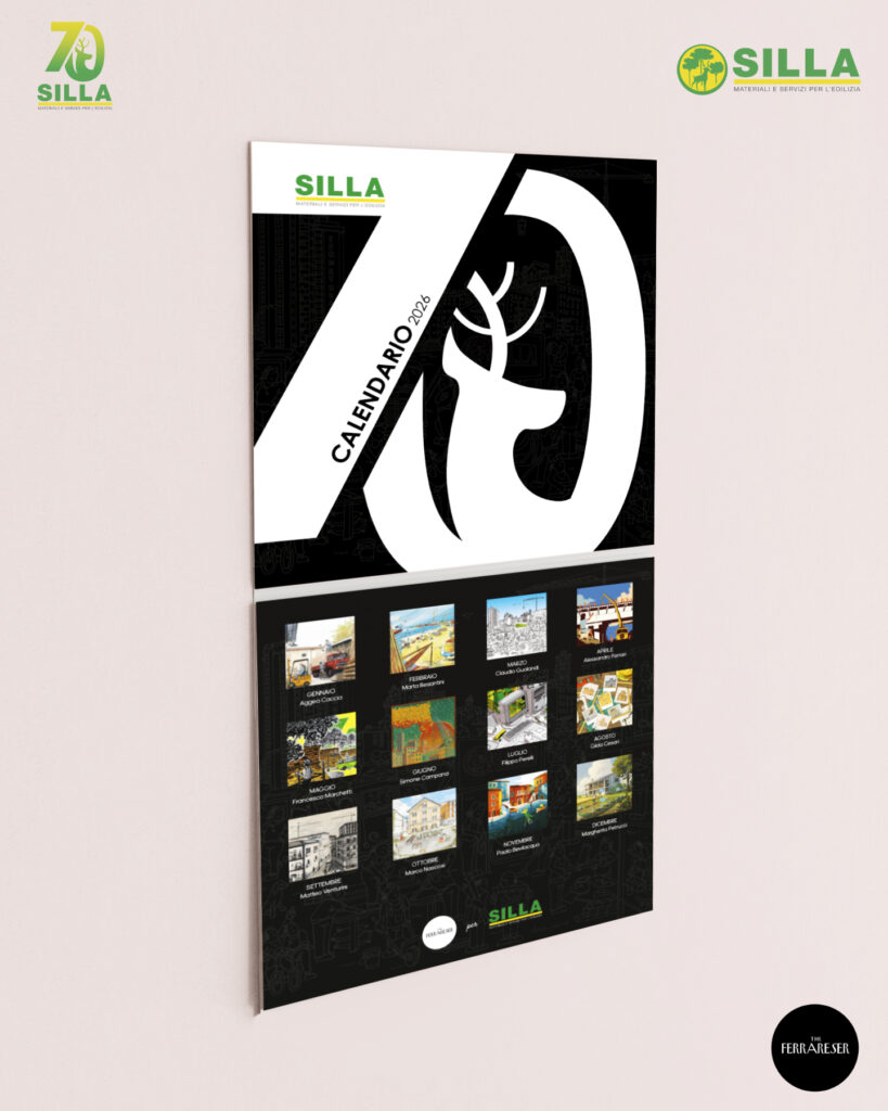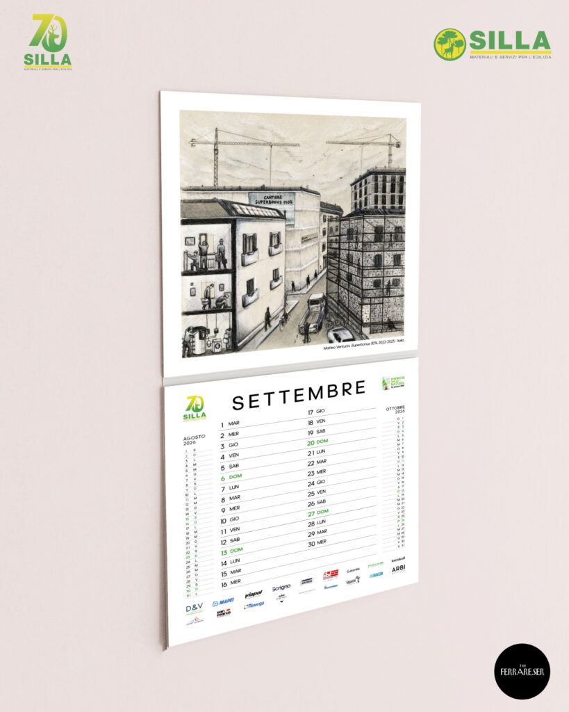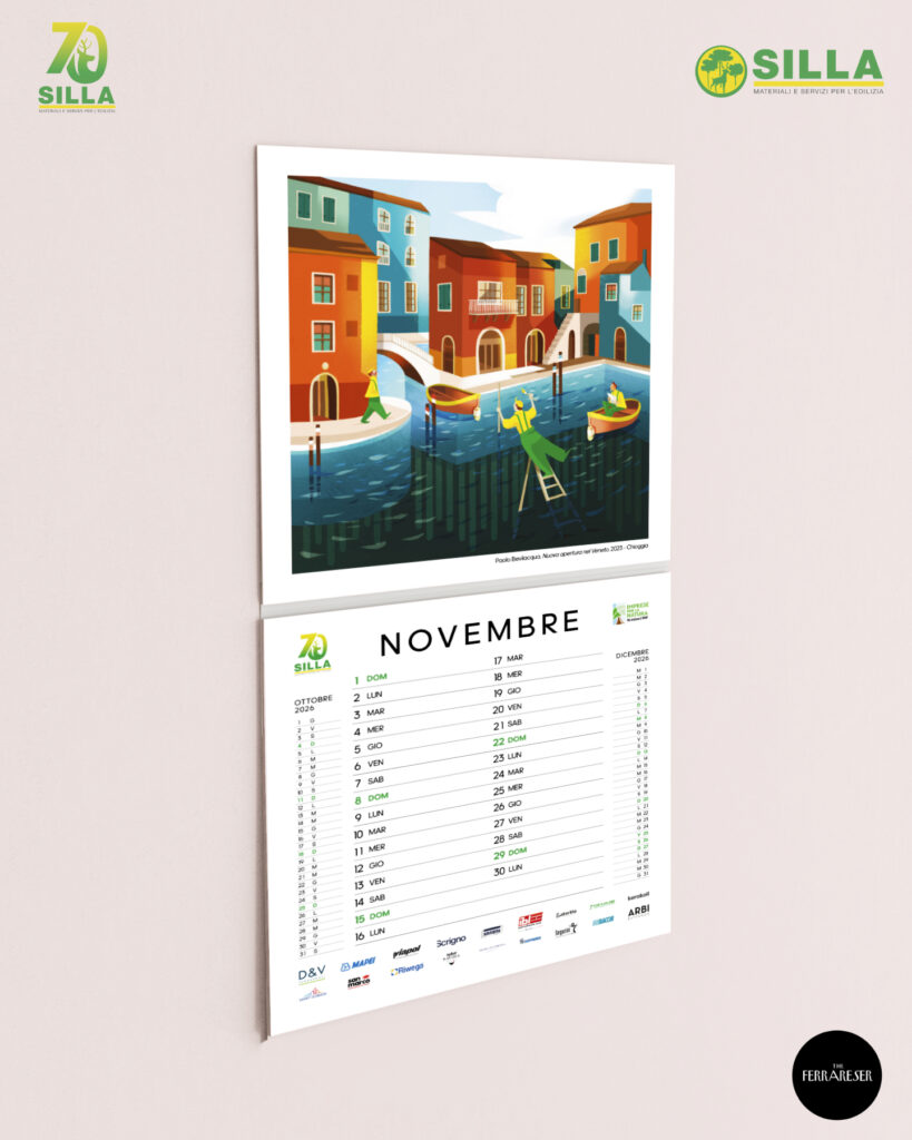 La copertina del calendario 20261. Le fondamenta, 1956 Copparo – La nascita dell’azienda S.I.L.L.A. a Copparo (Autore – Aggeo Caccia)2. Tutti al mare, 1950-1960 Lidi Ferraresi – Gli italiani scoprono il piacere delle vacanze, la nascita dei Lidi Ferraresi, accompagnata dallo sviluppo del territorio e di S.I.L.L.A. (Autore – Marta Besantini)3. Il miracolo economico, Anni ’60 Ferrara – Il calcestruzzo diventa il simbolo del progresso, Ferrara cambia volto, una città in crescita (Autore – Claudio Gualandi)4. Il nuovo Ponte sul Po, 1980 Polesella (RO) – Il vecchio ponte di chiatte viene sostituito dal nuovo ponte in cemento armato (Autore – Alessandro Ferrari)5. Le Mura Estensi, 1985 – 1988 Ferrara – Migliaia di mattoni per il recupero di uno dei simboli della città di Ferrara, che sono valsi il riconoscimento come Patrimonio dell’Umanità da parte dell’UNESCO (Autore – Francesco Marchetti)6. L’Espansione, 1980-2000 Emilia Romagna – Il periodo della crescita dell’azienda S.I.L.L.A. con l’apertura di nuove filiali in Emilia-Romagna e Veneto (Autore – Simone Campana)7. Digitization, 1990 Il Mondo – Il passaggio dall’analogico al digitale, una continua ed inarrestabile evoluzione. Proprio in questi anni il disegno tecnico a mano viene sostituito dal software AUTOCAD (Autore – Filippo Perelli)8. Il terremoto dell’Emilia, 2012 Modena, Ferrara, Bologna – La terra del Modenese e dell’alto ferrarese trema. È tempo di consolidare e ricostruire per rinascere (Autore – Gilda Cesari)9. Superbonus 110%, 2022-2023 Italia – Edifici “impacchettati”, cappotti termici, risparmio energetico, hanno caratterizzato le ristrutturazioni del Superbonus e dei fondi PNRR (Autore -Matteo Venturini)10. L’alluvione dell’Emilia-Romagna, 2023 Romagna – “Tien bota!” è quello che ha fatto questo territorio. Il drammatico evento è rappresentato dal Teatro Rossini di Lugo, dove S.I.L.L.A. è presente; anche le filiali di Ravenna e Lugo hanno subito ingenti danni (Autore -Marco Nascosi)1. Nuova apertura nel Veneto, 2023 Chioggia – Con la nuova filiale di Chioggia, S.I.L.L.A. è presente lungo tutto il tratto della Romea, da Ravenna passando per San Giuseppe di Comacchio e Mesola (Autore – Paolo Bevilacqua)12. L’AI nel settore edile, 2025 Il Mondo – Futuro e innovazione per una casa efficiente, sicura e sostenibile (Autore – Margherita Petrucci)