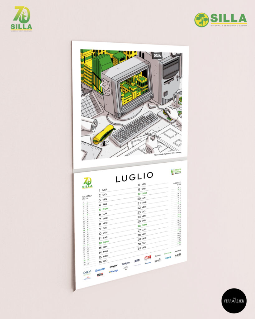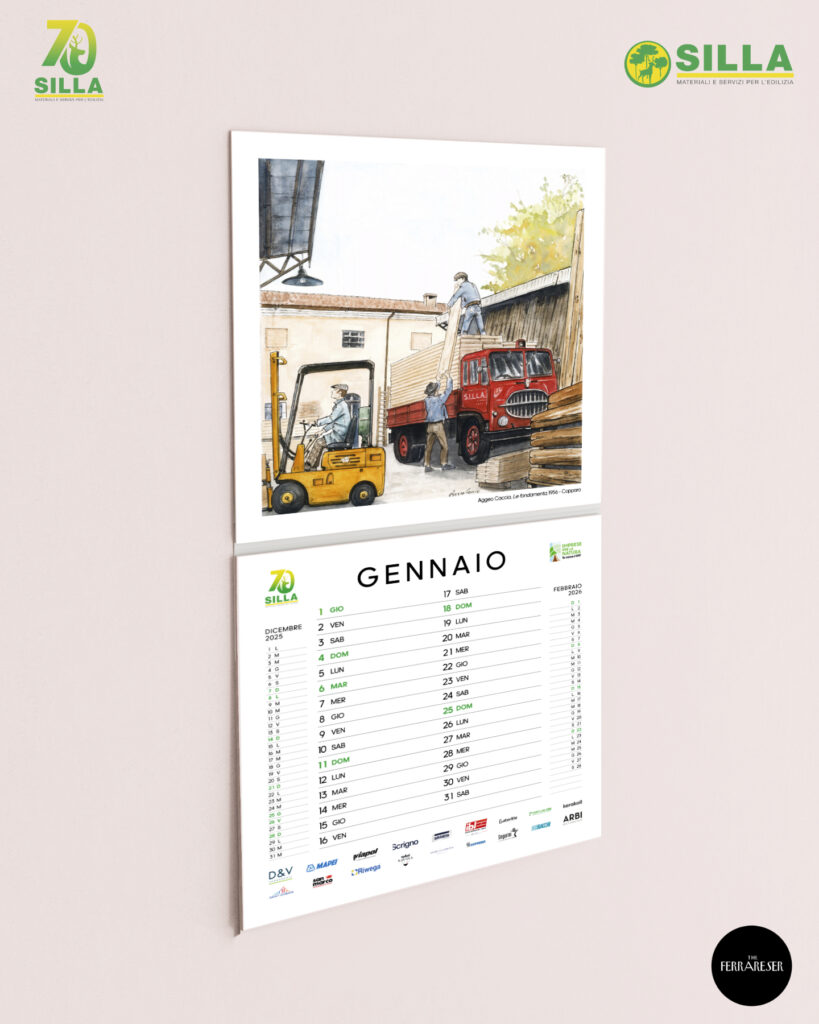 È nato così il calendario 2026, realizzato in collaborazione con gli illustratori di The Ferrareser, che da anni valorizzano Ferrara e il suo territorio attraverso illustrazioni e narrazioni grafiche. Ogni illustrazione è dedicata a una tappa significativa del percorso imprenditoriale di SILLA, interpretata con stili e sensibilità differenti. Un viaggio visivo che abbraccia settant’anni di cambiamenti, crescita aziendale e trasformazioni nell’edilizia e nei territori che SILLA raggiunge.